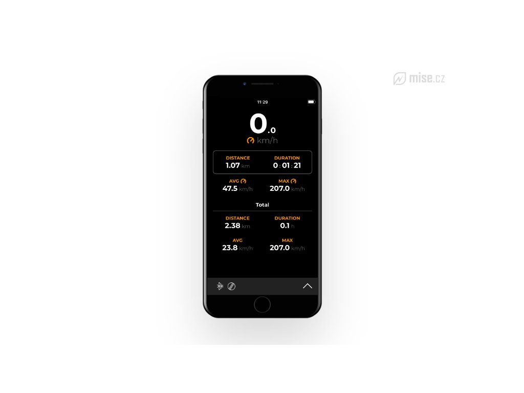 - Zobrazení na displeji: reálné hodnoty do 23 km/h, poté reálné hodnoty pouze v aplikaci SpeedBox